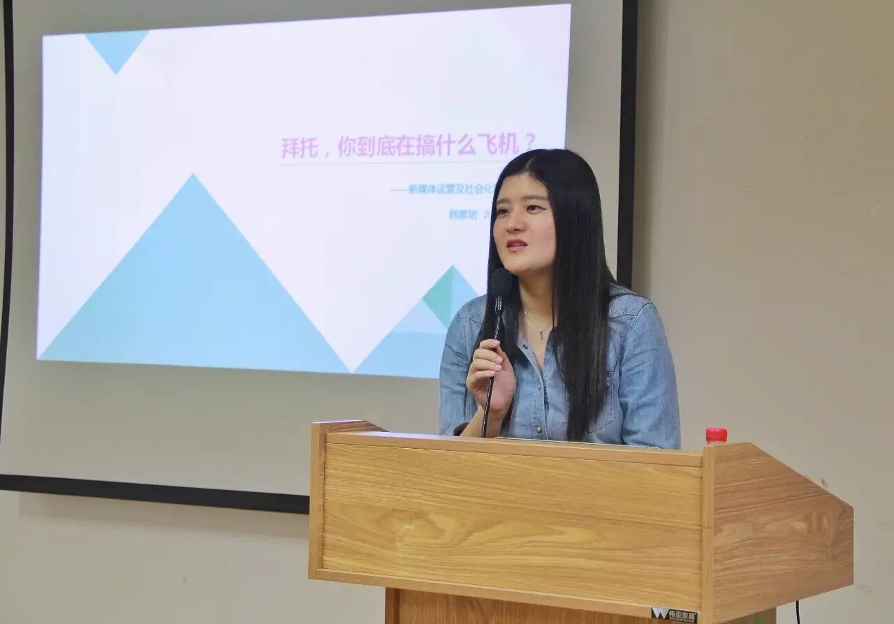 10月22日下午,悦众筹CEO、90后创客、我校新闻学13级校友韩雅珺回到母校,以“拜托,你在搞什么飞机?——新媒体运营及社会化营销浅见”为题,为各院系的研究生宣传骨干带来了一场别开生面的讲座。
